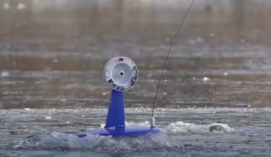 Lo schema di progettazione ripete la versione sopra descritta con l'unica differenza: lo spandiconcime si trova sotto il ghiaccio. Con la pesca passiva, l'attrezzatura viene controllata poche ore dopo l'installazione e si riduce la probabilità di ingoiare l'esca viva, poiché non c'è aggancio per mancanza di un sistema di segnalazione. Lo spandiconcime ruota liberamente sott'acqua in caso di morso e non si congela.