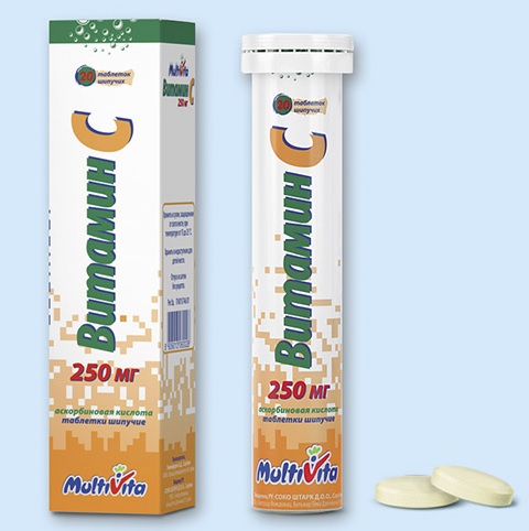 טבליות מבעבעות בטעם תפוז הן עגולות בצורתן, בצבע כתום חיוור ובעלות ארומה קלה ספציפית. עודף חומצה אסקורבית (מעל המינון היומי של 200 מיליגרם) מופרש במהירות ללא שינוי בשתן.