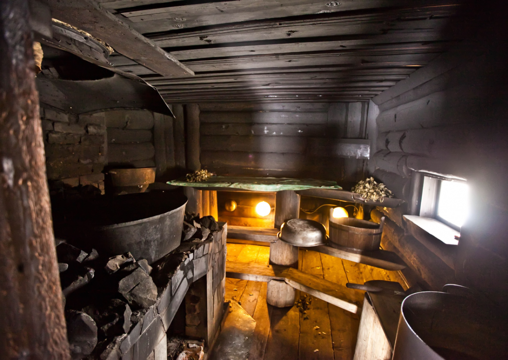 כשם שלעמינו יש אב קדמון משותף בדמם, כך שני הבניינים הללו באים מבית מרחץ רוסי בוער עצים, שחומם "בשחור". זה היה מבנה עץ ללא ארובה. כאשר נמס העשן יצא מבעד לסדקים קטנים שהתפשטו בכל החדר - ומכאן השם המקביל.