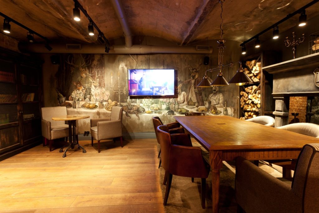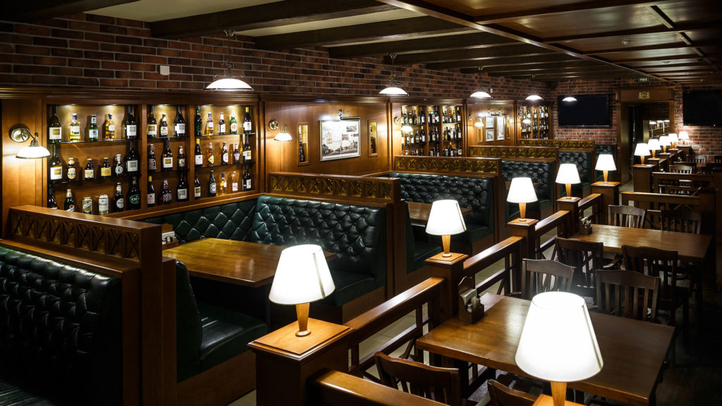 פאב סקוטי במוסקבה. הפנים הנעים מזכיר את הנוף מהסרט - לוחות עץ אלון מסיביים, שולחנות עץ מלא וספות עור.