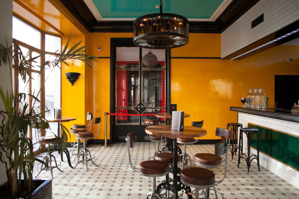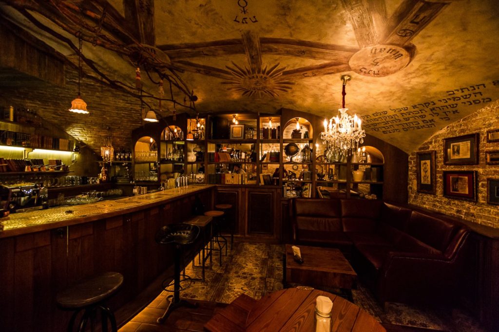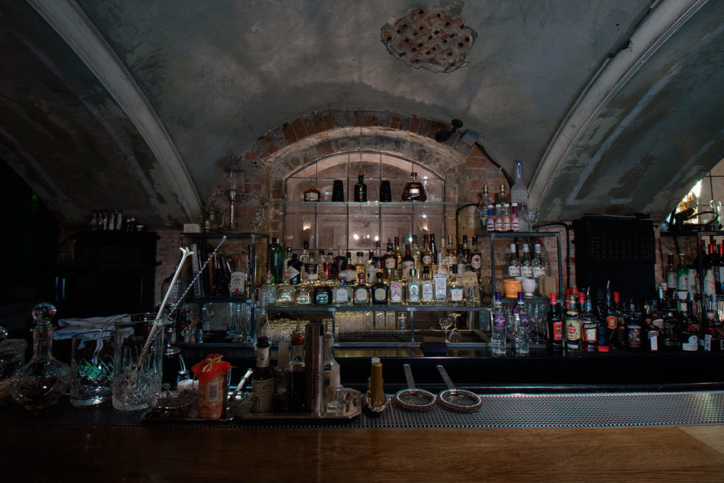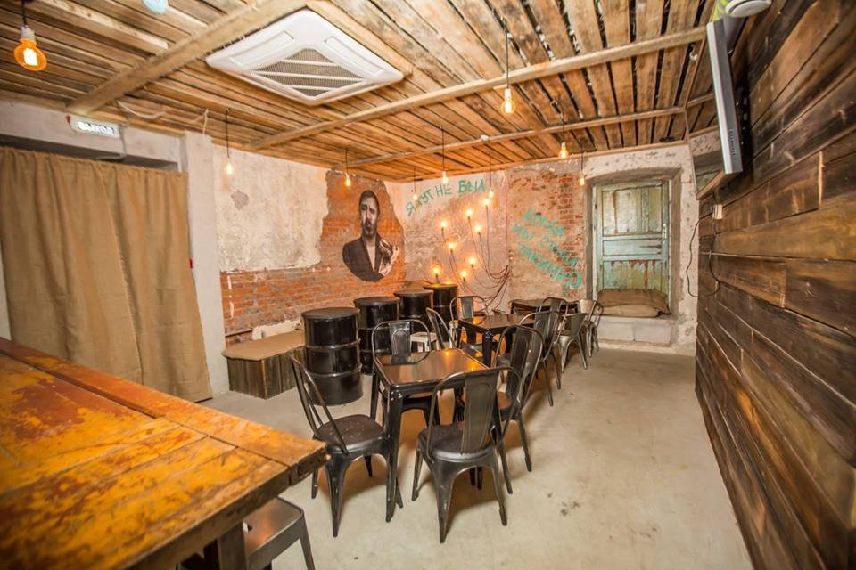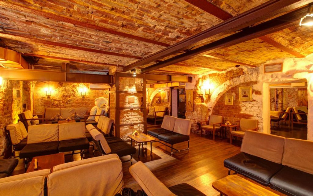 בר-קלאב עם עיצוב פנים מקורי. מראות מיושנות, קירות לבנים חשופים, ריהוט מוצק - משהו בין לופט לטירה מימי הביניים.