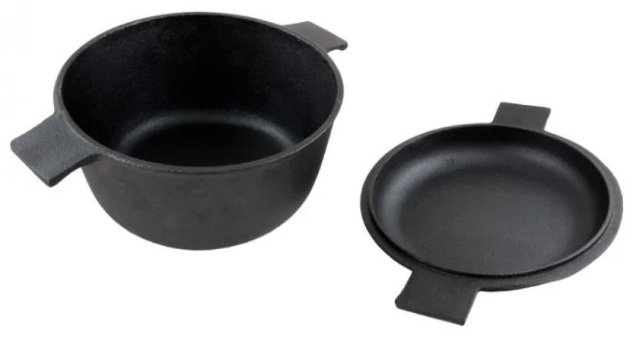 דגם ייחודי בעיצובו. העובדה היא שהמכסה כאן יכול לשמש גם כמחבת. למעשה, עבור 1800 רובל אנו מקבלים שני פריטים באחד. זה מאוד נוח. דיברנו על היתרונות של ברזל יצוק לעיל, כאן נציין רק את האפשרות להשתמש במוצר הן על הכיריים והן בתנור, ואת הנוכחות של הידוק מונוליטי של הידיות.