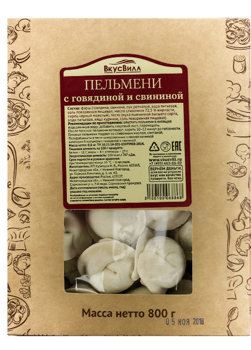 מוצר חצי מוגמר בשר טוב. המילוי מכיל רק בשר, בצל ותבלינים, ללא GMO, חומרים משמרים וסויה. הבצק צפוף, צבע צהבהב-לבן טבעי אינו נשבר במהלך הבישול.