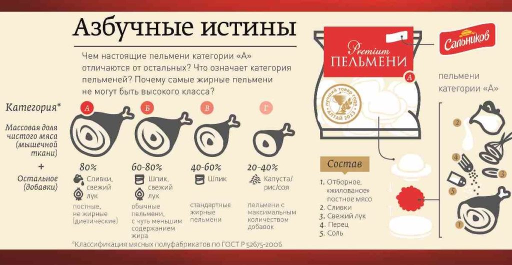 מציאת מוצרים חצי מוגמרים בקטגוריה A היא די קשה. היצרנים מוסיפים תבלינים שונים, בצל לבשר טחון, כך שמסתבר שנותרו פחות מ-80% לבשר. אז בעת הקנייה, אל תהסס לבחור במוצרים חצי מוגמרים מקטגוריה B, C - זה יהיה לא פחות טעים.