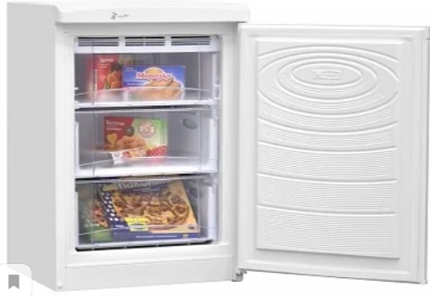 מקפיא מסוג אנכי בצבע לבן, עם מארז מתכת-פלסטיק. זה יכול להיות מותקן ברווח קטן של שטח, שכן יש לו דלת נשלפת.