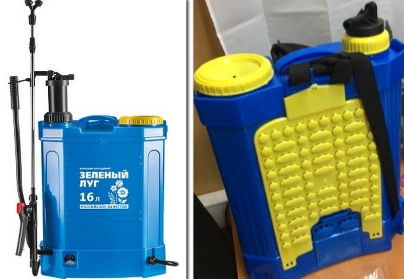 מרסס מסוג תרמיל, כולל משאבה, צינור, שתי פיות נוספות וממטרה. חומר בנייה - פלסטיק, צבע - אפור + צהוב, רתמות - בד. הבסיס הרחב מאפשר להניח את המכשיר על משטח שטוח. על המקרה שהסקאלה הנמדדת מונחת, יש מהדק של השקיה רציפה ושסתום הבטיחות.