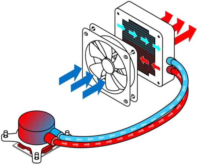 לאחר מכן הוא מועבר דרך שכבת משחה תרמית לצלחת בסיס אלומיניום או נחושת, שהיא מרכיב של יחידת הקירור הנוזלית. המים שמסתובבים במעגל, עוברים במעגל, לוקחים חום מלוח הבסיס ושולחים אותו דרך הצינור לרדיאטור. שם, אוויר פועל על הנוזל ועוזר לו להתקרר, ומאווררים מחוברים מוציאים את החום החוצה. לאחר מכן, הנוזל מסופק שוב כדי לחזור על המחזור. המחזור מסופק על ידי משאבה מיוחדת.