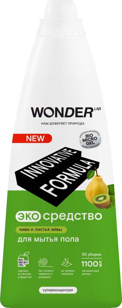 לניקוי רצפות מרוכז ידידותי לסביבה של המותג המקומי WONDER LAB יש ארומה קלילה שלא תגרה אפילו את הרגישים ביותר לריחות זרים. המוצר אינו דורש שטיפה ובטוח לבתים עם ילדים וחיות מחמד. צריכה חסכונית - נדרשת 1/3 מכסה בלבד ל-5 ליטר.