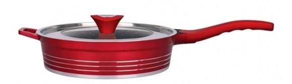 עיצוב אלגנטי ומואר של מחבת מסוג מחבת עם דוגמת תבליט בתחתית. הצבע אדום, בידית יש חור לתלייה.