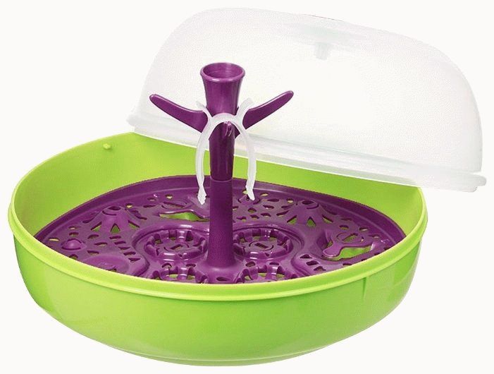 רב תכליתי, עמיד וללא רבב. המכשיר מחטא תכונות לילדים: 5 בקבוקים, פטמות, כולל צעצועים. הסטריליזטור אינו מיועד לחפצי מתכת, זה אופייני לכל תנורי המיקרוגל.