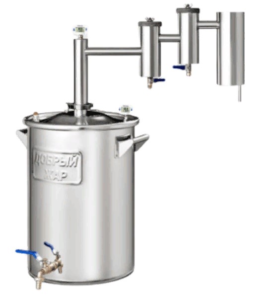 עיצוב זה מאפשר לך לקבל מוצר זיקוק כפול איכותי תוך זמן קצר. עיצוב המזקק כולל מיכל ראשי בנפח 20 ליטר, זכוכית פנימית, צידנית במעגל כפול, ספינת קיטור יבשה מתקפלת. האחרון משמש לטיהור נוסף ולארומטיזציה של אלכוהול גולמי. היצרן דאג לנוכחות של מנוף לבחירת ראשים וזנבות, שיקל על בחירת מספר הראשים הנדרש מהגרירה הראשונה, תוך חיתוך הזנבות. נוחות נוספת ואפשרויות שימוש רחבות יותר מסופקות על ידי נוכחותם של שני מדי חום אלקטרוניים, תחתית שטוחה, ספינת קיטור המצוידת בברז ניקוז.