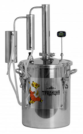 צילומי סטילס Moonshine תחת המותג Tradition מיוצרים על ידי צ'ליאבינסק UZBI. הדגם זמין במספר גדלים.למיכל 14 ליטר גובה של 30 ס"מ וקוטר של 24 ס"מ. חומר הבנייה העיקרי הוא נירוסטה באיכות מזון. תחתית קוביית הזיקוק בעובי של 2 ס"מ, היא קפסולרית. זה מאפשר לך לחמם את המיכל על כל סוג של כיריים, כולל אינדוקציה. אין גוף חימום מובנה.