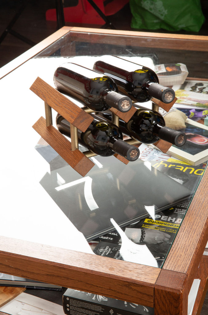 Maskvos meno biuro Wood4Wine vidaus gaminys pagamintas iš natūralaus ąžuolo medienos ir skirtas keturiems vyno buteliams laikyti horizontalioje padėtyje.Šio modelio medinės sijos derinamos su žalvariniais metaliniais vamzdžiais, todėl dizainas yra originalus ir gražus. Visų gaminio paviršių tvirtumas, ilgaamžiškumas ir atsparumas mechaniniam poveikiui užtikrinamas jų apdorojimu, kuris susideda iš šešių etapų. Tai privalomas šlifavimas, medinių dalių impregnavimas aukštos kokybės alyvomis, poliravimas ir padengimas apdailos laku. Gamintojas ypatingą dėmesį skiria vien rankų darbo gaminių išskirtinumui. Todėl pirkdami Wood4Wine gaminį galite būti tikri, kad tikslaus analogo jis neturės.