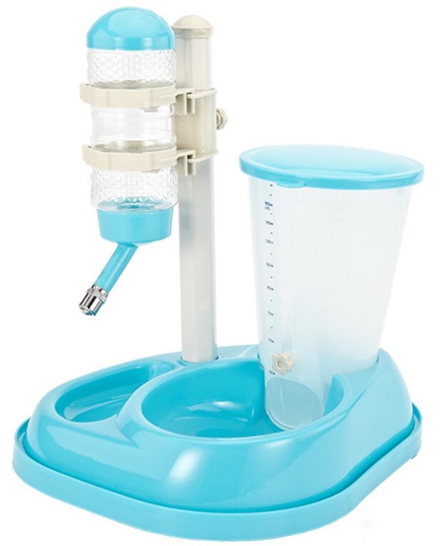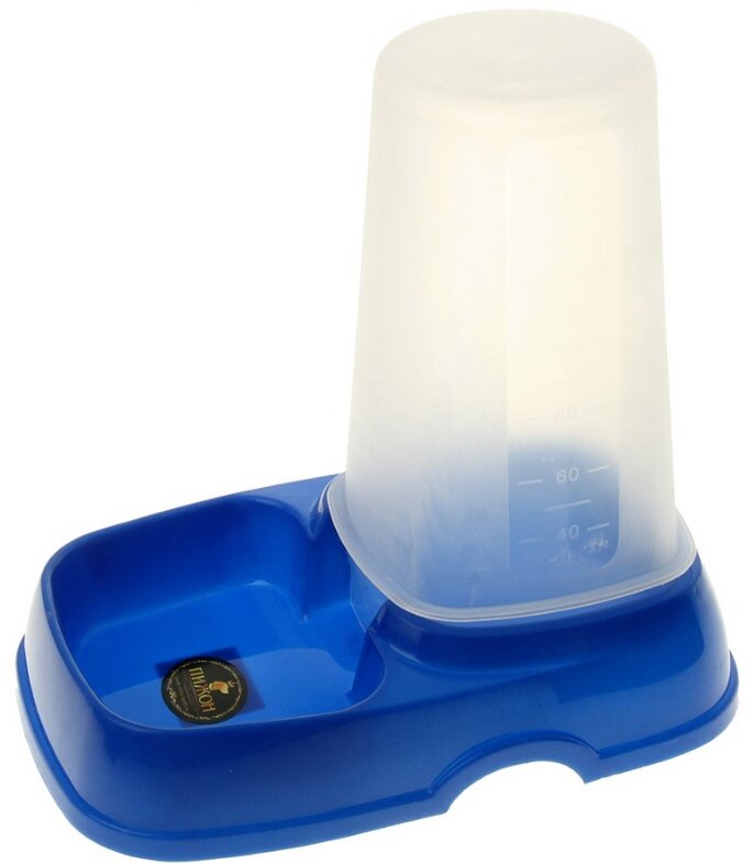 Išsiskiria universaliu dizainu – lesyklėlė, girdykla. Medžiaga - plastikas. Spalva: permatoma (vandens talpyklos, granulės), mėlyna (dangteliai, dubuo).