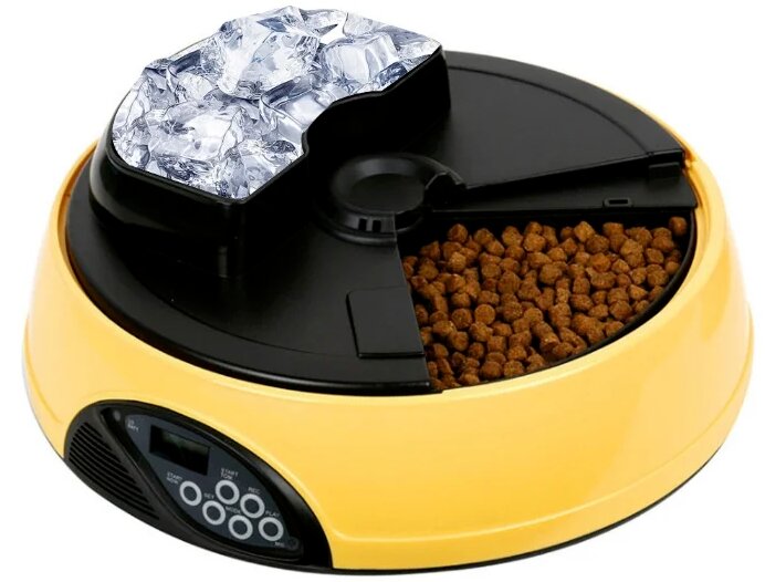 Skiriasi ledui, vandeniui skirta sekcija – viršutinė panelė, atskiras dangtis. Gaminio viduje – 4 atskiros sekcijos. Galite naudoti įvairių rūšių maistą. Apatinė pusė – guminės pagalvėlės, 4 skyreliai (baterijos „C“ tipo).