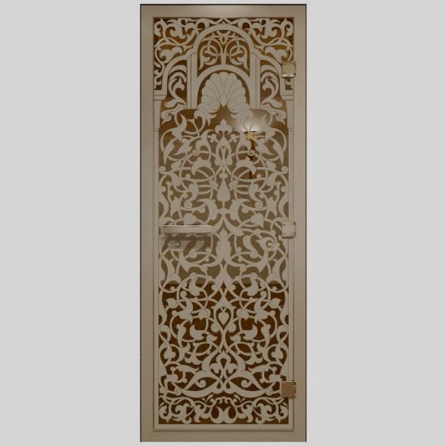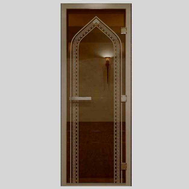 Stiklo gaminys turkiškam hamamui.Sustiprintas tvirtinimas ir unikalus dizainas. Universalus variantas: galima atidaryti tiek į dešinę, tiek į kairę. Ant stiklo nupiešta išskirtinė rytietiška arka. Žvelgdamas į ją, esi pripildytas šilumos, komforto ir rytietiškos paslapties. Termiškai grūdinto stiklo lakštas. Dėžutė yra anoduoto aliuminio, padidinto atsparumo korozijai. Stiklo perimetre yra magnetinė juosta, kuri tvirtai priglunda prie verandos. Apatinė dalis aprūpinta silikoniniu potvyniu. Rankena su patogia rankena.