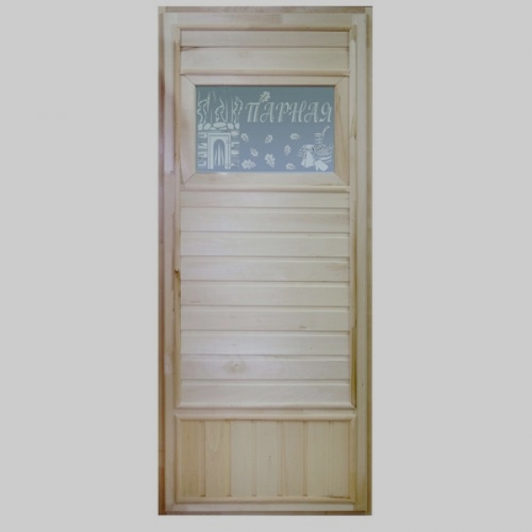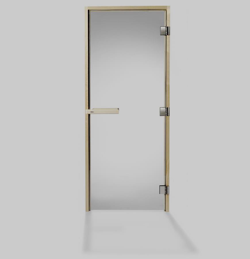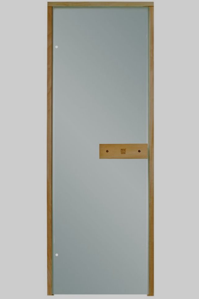 Stiklinės durys labiau tinka elitinėms pirtims. Permatomas, satininis – matinis. Parametrai: 190*70 cm.Liepinė dėžė. Stiklas su poliruotomis briaunomis ir nuožulniais buvo termiškai apdorotas. Skatina šviesos srautų perdavimą viduje. Tačiau pro jį matosi tik besimaudančių siluetai. Suteikia interjerui paslaptingumo, jaukumo ir komforto. Su stipriu smūgiu jis gali sulūžti, bet nepakenks šalia esančiam žmogui, nes tiesiog subyrės į smulkias daleles. Saugumo sumetimais numatytas 4 cm tarpelis.