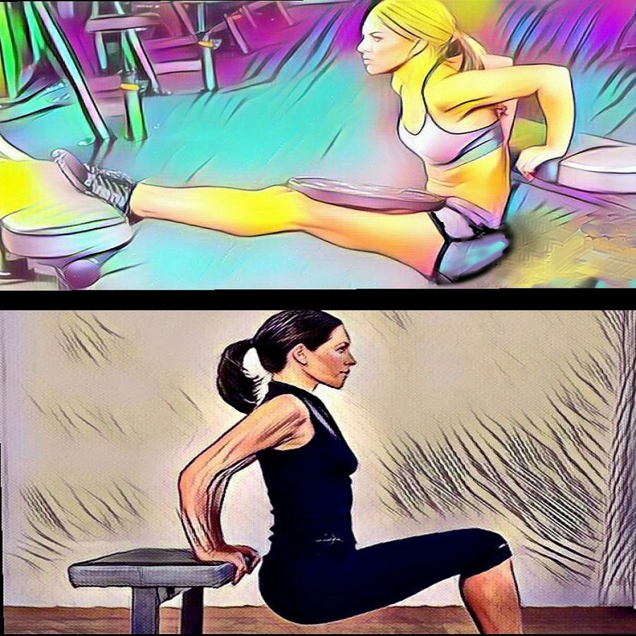 Jie daugiausia naudojami tricepsui ir deltai treniruoti, tačiau daugelis pamiršta, kad jie taip pat gerai lavina didžiąją krūtinės raumenį. Atliekamas ant kėdės, suolo ar kitos stabilios rankos atramos. Lengvesnis variantas merginoms, kurios anksčiau nesportavo: kojos ant grindų, keliai šiek tiek sulenkti, delnai padėti už kūno ir atsiremti į suolą ar kėdę pečių plotyje, dubuo yra arti sviedinį, bet jo neliečia. Įkvėpus, dubuo sklandžiai nusileidžia, kojos sulenktos per kelius, rankos ties alkūnėmis. Iškvėpus – sklandus grįžimas į pradinę padėtį. Atlikite nuo 10 iki 20 pakartojimų 3-4 rinkiniais. Kai 20 pakartojimų lengva, ant kelių galite užsidėti štangos blyną, hantelį arba 2 litrų vandens butelį. Padidinti krūvį galite pakeldami kojas – tam prireiks antros kėdės ar suoliuko.