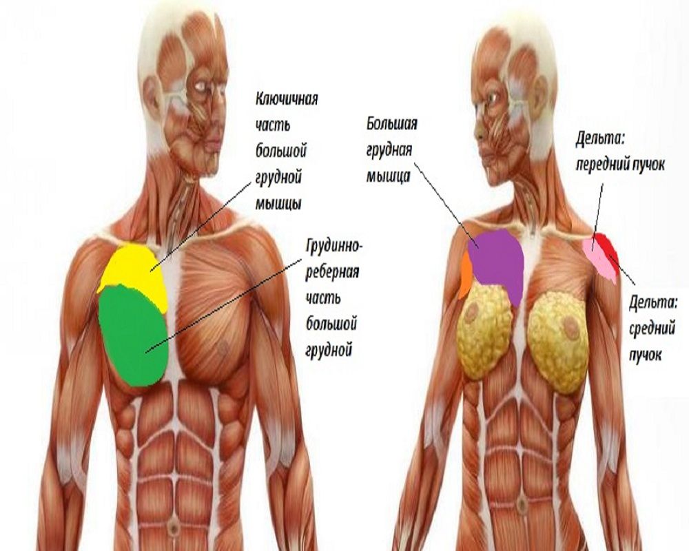 Vyrai turi tvirtą krūtinės raumenį, suskirstytą į dalis: raktikaulį, raktikaulį-šonkaulinį ir kt. Moterims iš tikrųjų tik viršutinė jo dalis yra paviršiuje. Likę raumenys yra tiesiai ant šonkaulių, po plačiu riebalų sluoksniu, supančiu pieno skilteles. Tiesą sakant, moterys gali dirbti tik su viršutine krūtinės raumens dalimi ir ją supančiais raumenimis: coracobrachialis, dantytu ir deltiniu raumeniu. Dirbdami su jais papildomai, galite tarsi „pritraukti“ juos arčiau krūtinės, taip vizualiai padidindami biusto apimtį.