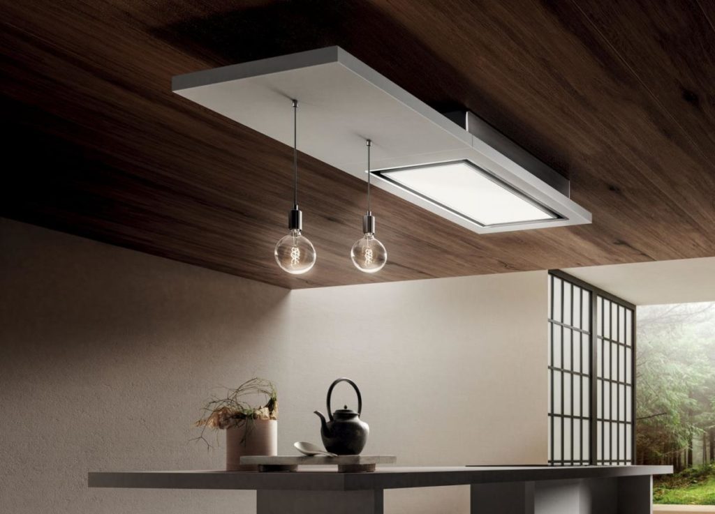 Prie lubų montuojami gartraukiai puikiai papildo virtuvės įrangą, esančią tam tikru atstumu nuo sienų.