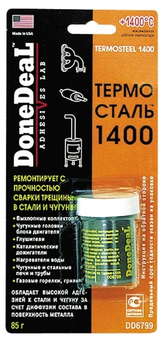 Sealant dijual dalam balang 85 g, untuk 320 rubel. Sesuai untuk membaiki kereta, enjin, sistem ekzos. Ia juga boleh digunakan untuk paip besi dan keluli, relau dan peralatan lain. Tahan sehingga 1400 darjah kerana komponen logam. Mengeras sepenuhnya dalam 3-4 jam.