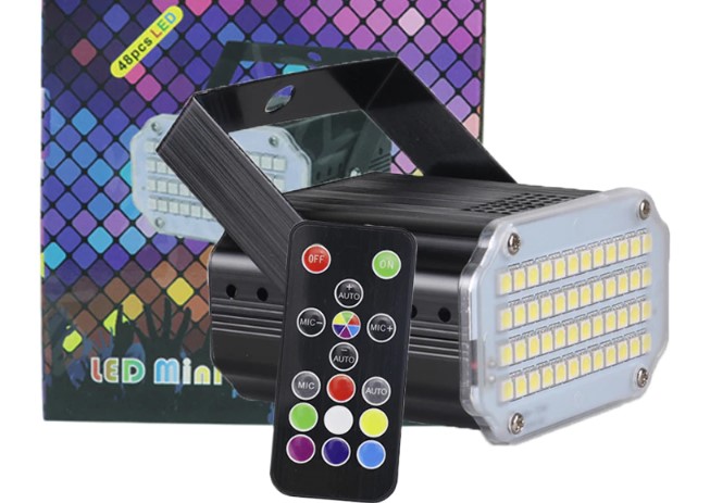 48 LED terang, kemungkinan cahaya ultra-ungu dan putih akan menjadikan mana-mana pihak tidak dapat dilupakan. Kelajuan stroboskop boleh dikawal; untuk ini, peranti mempunyai tombol khas dengan penanda biru. Tombol kedua akan membolehkan anda memilih mod pengendalian, melaraskan kawalan bunyi atau mendayakan autorun. Peranti boleh dipasang pada mana-mana permukaan atau digantung dengan pemegang. Walau bagaimanapun, perlu diingat bahawa peranti ini dikuasakan oleh rangkaian, dan panjang kabel hanya 1 meter.