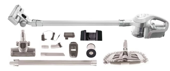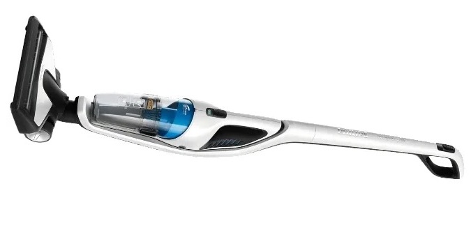 Pembersih vakum tanpa wayar berwarna kelabu dengan pemegang biru mempunyai penunjuk penuh beg habuk, pelarasan kuasa sedutan (beberapa mod) dan penapis halus. Model ini dilengkapi dengan paparan kristal cecair, paip sedutan satu keping. Menyediakan keupayaan untuk menyimpannya dalam beberapa cara: menggantungnya di dinding atau meninggalkannya di permukaan (contohnya, lantai, rak).