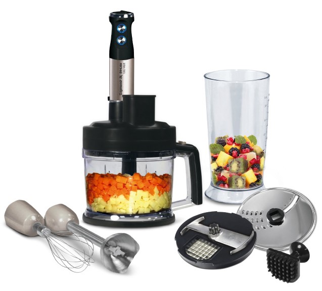 Badannya diperbuat daripada aluminium anodized berkualiti tinggi, bilahnya diperbuat daripada keluli tahan karat. Set lengkap: selain itu terdapat nimbus untuk sebat krim dan telur. Pengisar membolehkan anda bukan sahaja mengisar daging, tetapi juga untuk membuat puri sayuran. Pengilang: Casa. Kos: 9350 rubel.