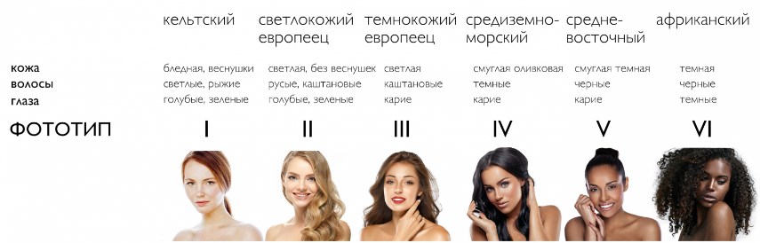 Bergantung pada ciri ini, tahap perlindungan dipilih. Angka itu jelas menunjukkan 6 fototaip mengikut Fitzpatrick: warna ciri kulit, rambut, mata.