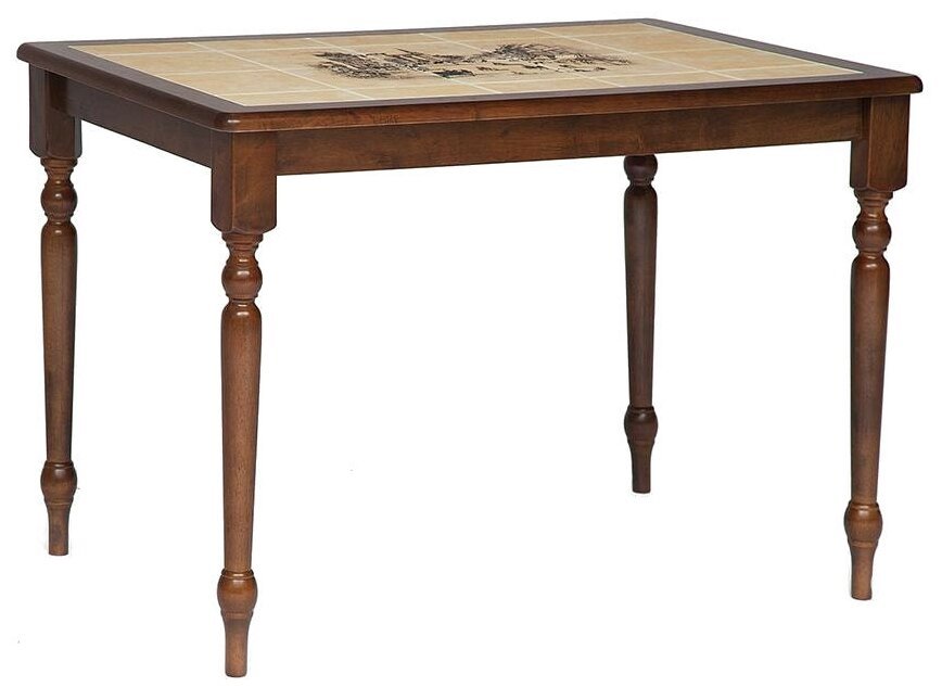 Bentuk segi empat tepat menjadikannya serba boleh untuk sebarang saiz dapur. Strukturnya diperbuat daripada kayu, tetapi perhatian khusus harus dibayar ke atas meja dengan jubin seramik. Corak yang unik dan bergaya menjadikan bahagian atas meja bergaya. Kaki yang diukir juga menarik.