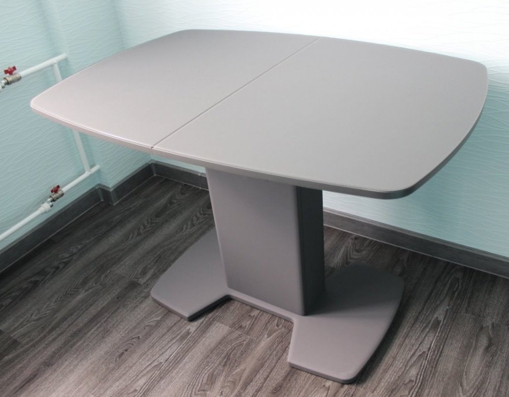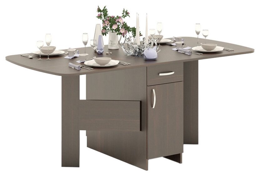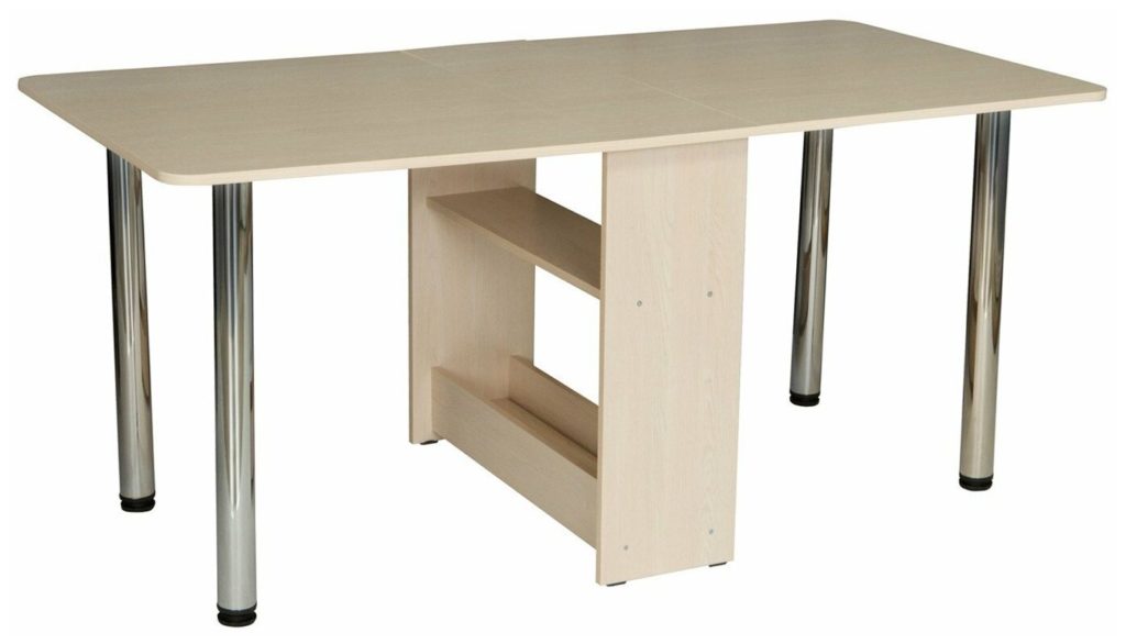 Meja dilipat, di tengah terdapat sisipan khas yang meningkatkan saiz permukaan meja. Oleh itu, produk itu boleh digunakan bukan sahaja sebagai dapur, tetapi juga untuk makan.