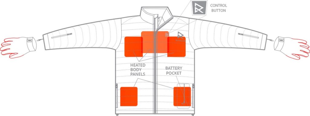 Seperti yang dinyatakan di atas, produk yang dipersoalkan menggabungkan panel pemanas atau plat yang dijahit, yang, dengan pemanasan, memindahkan haba dari jaket ke tubuh manusia. Panel beroperasi daripada penyambung USB apabila bank kuasa disambungkan, walaupun sumber kuasa lain mungkin disediakan. Mereka boleh berbeza dalam kuasa mereka dan dalam bilangan mereka, i.e. bilangan plat yang dijahit ke dalam jaket / vest yang berasingan. Perlu diperhatikan kecekapan plat pemanasan ini - bank kuasa dengan kapasiti 10,000 mAh akan sepenuhnya meliputi 6-8 jam operasi dalam mod ekonomi, dan dalam mod yang dipertingkatkan ia akan bertahan 3-5 jam (yang bergantung pada kawasan pemanasan dan bilangan elemen kerja).