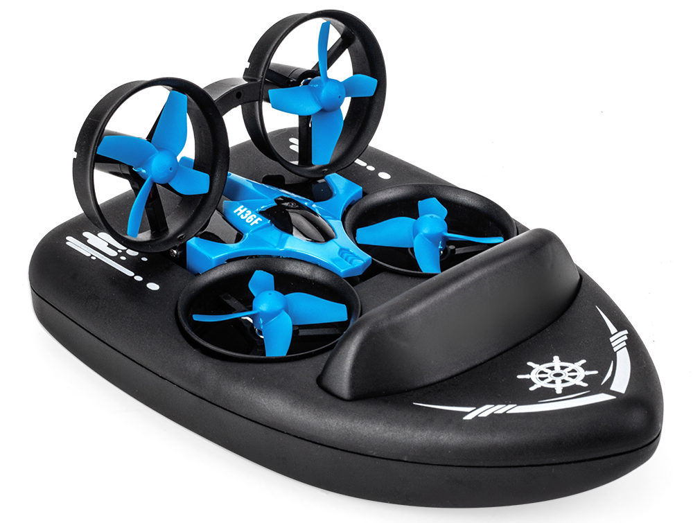 Mainan dengan fungsi kawalan dron dan luncuran hoverkraf (juga boleh digunakan dalam mod tanah, pada permukaan licin dan rata).Daripada fungsi - mod perancangan, belok kiri dan kanan. Mod empat paksi membolehkan anda mengangkat mainan tinggi ke udara.