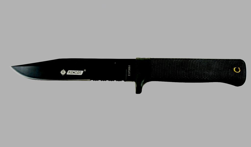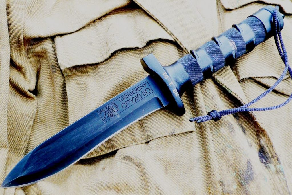 Produk buatan Rusia dengan bilah besar - 193 cm Beratnya 362 gram. Digunakan untuk menjadi kekerasan 58 - 59, pemegangnya diperbuat daripada aluminium. Hadiah yang sesuai untuk lelaki yang memilih untuk tidak tinggal di rumah, tetapi menguji diri mereka untuk ketahanan di alam liar, mendapat banyak keseronokan daripadanya. Ia tidak boleh dibandingkan dengan senjata buatan sendiri. Perkara yang sangat diperlukan sekiranya berlaku keadaan yang melampau. Oleh kerana kualiti dan kekuatan keluli, bilah boleh menahan beban yang ketara dan tidak menghakis. Salutan titanium hitam menghalang bilah daripada kerosakan mekanikal. Pemegang dilengkapi dengan NAZ (mancis, tali pancing, plaster pelekat, pin, pemberat, wayar, jarum dan benang, dua bilah).Punggung dengan serong khas, yang akan, jika perlu, memotong tulang.