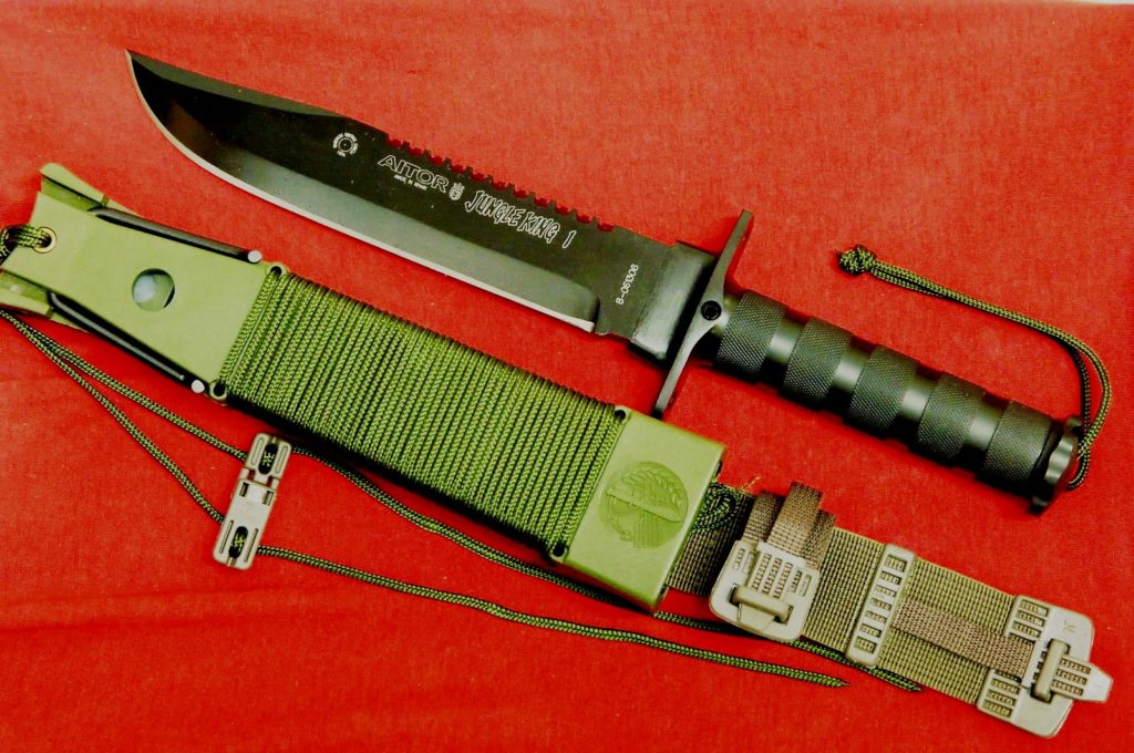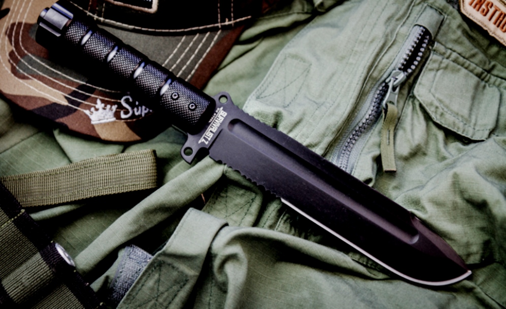Produk terkenal dari pengeluar China. Panjang bilah ialah 25 cm Indeks kekerasan keluli turun naik dalam julat 55. Pemegangnya sepenuhnya logam, yang menjejaskan berat struktur secara negatif (880 g). Kami berhutang prototaip pertama produk kepada tuan krafnya - Jimmy Lyle. Dialah yang didekati oleh pengarah filem Rambo untuk mencipta pedang legenda. Ia ternyata berat dan memanjang, tetapi mampu menggantikan kapak kecil. Untuk menyelesaikan masalah kecil, reka bentuk diiktiraf sebagai tidak begitu mudah. Di dalam pemegang terdapat bekas tertutup yang mengandungi: