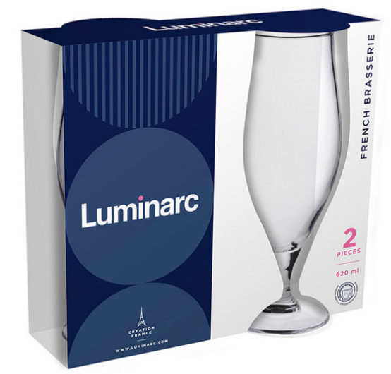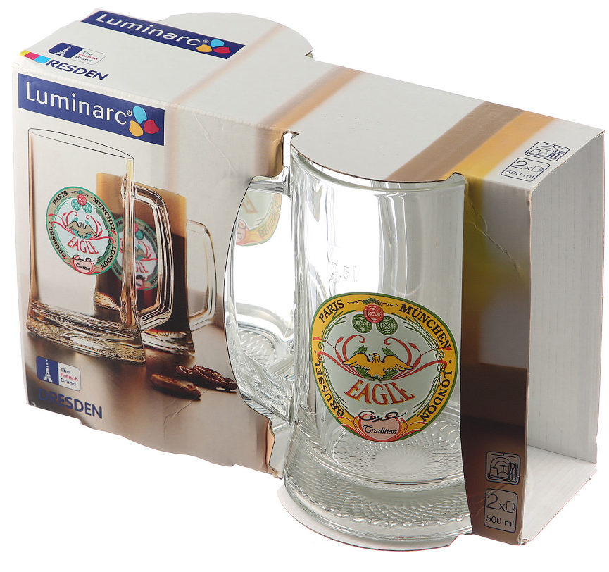 Syarikat Perancis Luminarc terlibat dalam pengeluaran pinggan mangkuk, yang sangat diminati di kalangan pembeli kerana kualiti barang yang tinggi. Antara produk yang dihasilkan terdapat cawan untuk bir. Dresden dianggap sebagai salah satu set yang paling popular; ia termasuk dua cawan dengan jumlah 0.5 liter.Barangan tersebut diperbuat daripada kaca berkekuatan tinggi berkualiti tinggi dan, disebabkan kualiti bahan, mengekalkan penampilan yang menarik untuk masa yang lama, walaupun walaupun kerap digunakan. Ketelusan kaca memungkinkan untuk melihat semua warna minuman yang dituangkan, dan bentuk cawan difikirkan dengan baik sehingga membolehkan anda mengekalkan kandungannya untuk masa yang lama. Pinggan mangkuk boleh dibasuh bukan sahaja dengan tangan, tetapi juga di mesin basuh pinggan mangkuk. Set ini dijual dalam pembungkusan hiasan dan sesuai sebagai hadiah.