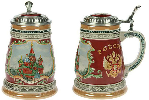 Model asal pengeluar Rusia diperbuat daripada seramik, bahagian luar dihiasi dengan imej relief dan lambang negara. Sarung ini mempunyai pemegang yang mudah untuk dipegang dan penutup yang dibuka dengan menekan jari. Kapal sedemikian mengekalkan suhu dan aroma cecair yang dituangkan ke dalamnya untuk masa yang agak lama.