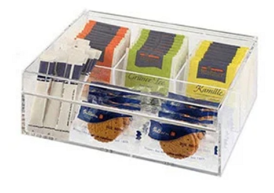 Pelbagai aksesori hidangan diwakili oleh bekas 6 petak dengan badan akrilik telus.