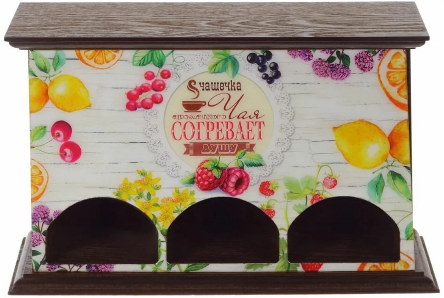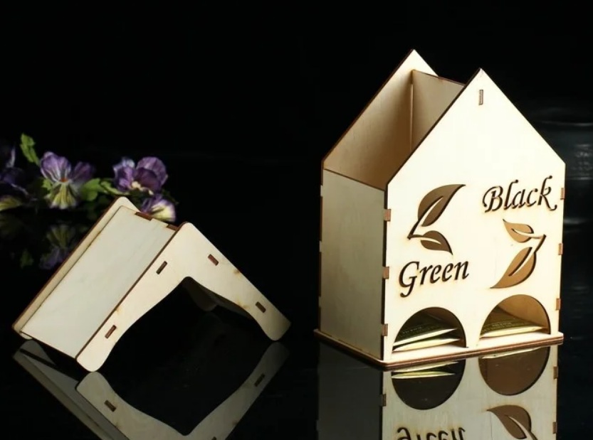 Cetakan cantik pada kotak kayu semula jadi dalam bentuk rumah dengan bumbung akan menjadikannya tradisional untuk menyimpan beg di satu tempat. Kedua-dua isi rumah dan pekerja di dapur perkhidmatan akan menikmati kotak asal, yang dari masa ke masa akan tepu dengan aroma teh.