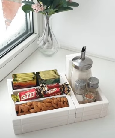 Untuk makanan di rumah, di belakang tabir, pilihan dari beberapa coaster yang dibuat dalam gaya yang sama menjadi popular, yang membolehkan anda meletakkan bukan sahaja beg teh, tetapi juga biskut, gula-gula, kacang.