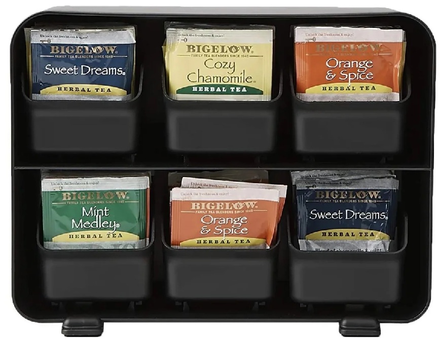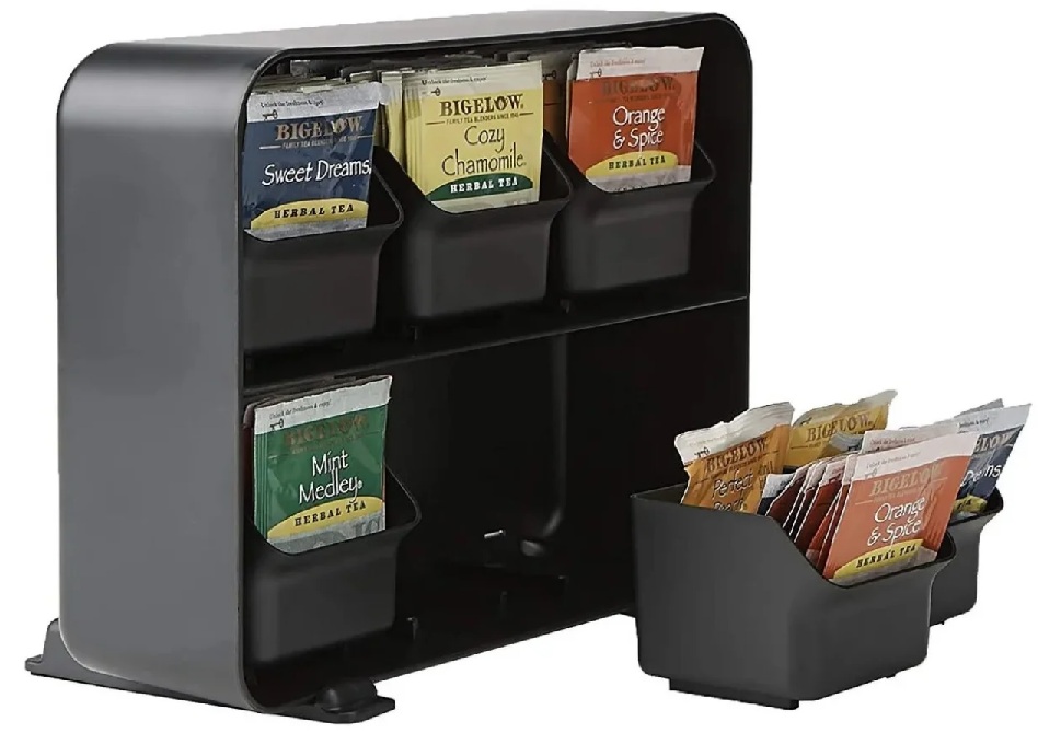 Dispenser eponim untuk 6 pek minuman berjenama membolehkan anda mengambil satu beg dari peringkat bawah varieti yang anda suka.