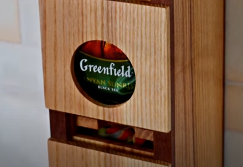 Dispenser eponim untuk 6 pek minuman berjenama membolehkan anda mengambil satu beg dari peringkat bawah varieti yang anda suka.