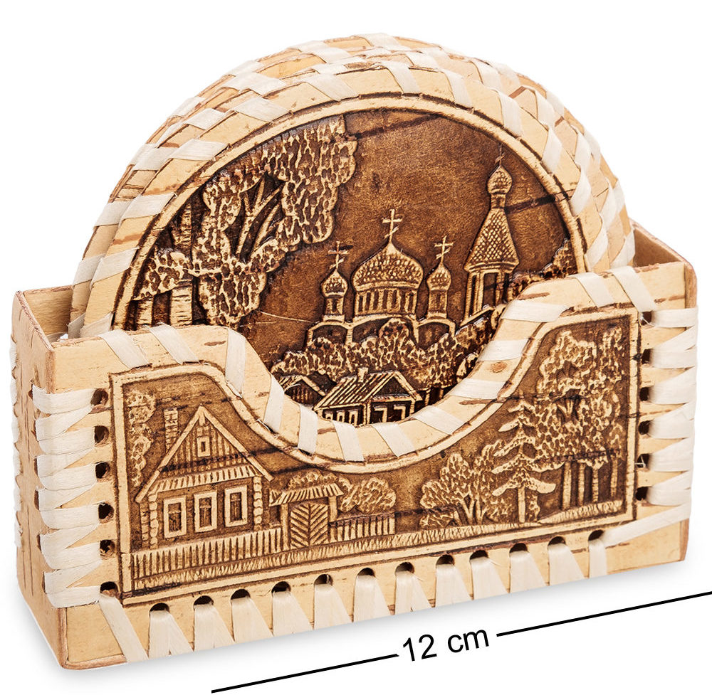 Pakej ini termasuk 5 elemen dapur untuk cawan dan gelas, serta kotak simpanan khas. Diperbuat daripada kulit kayu birch (kulit kayu birch), produk ini dihiasi dengan corak yang indah, yang menggambarkan sebuah kuil dengan pokok.