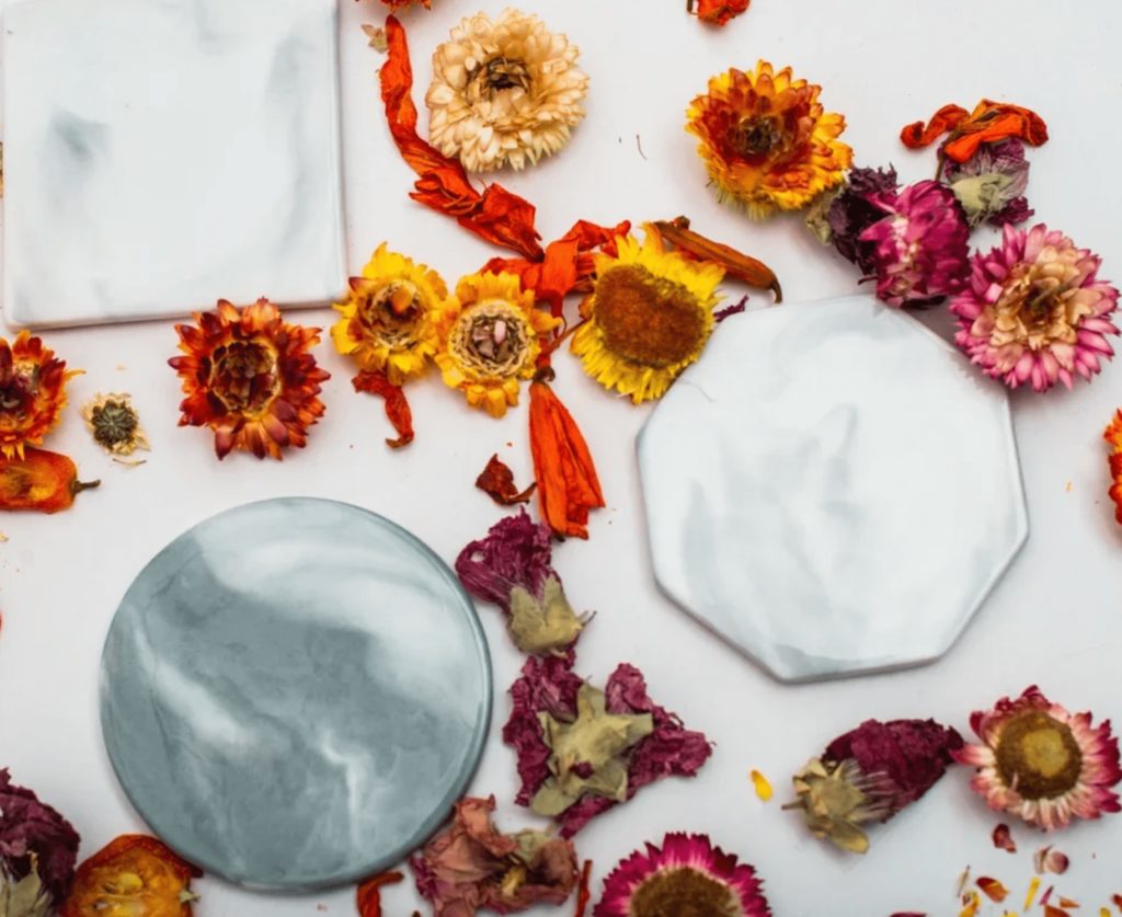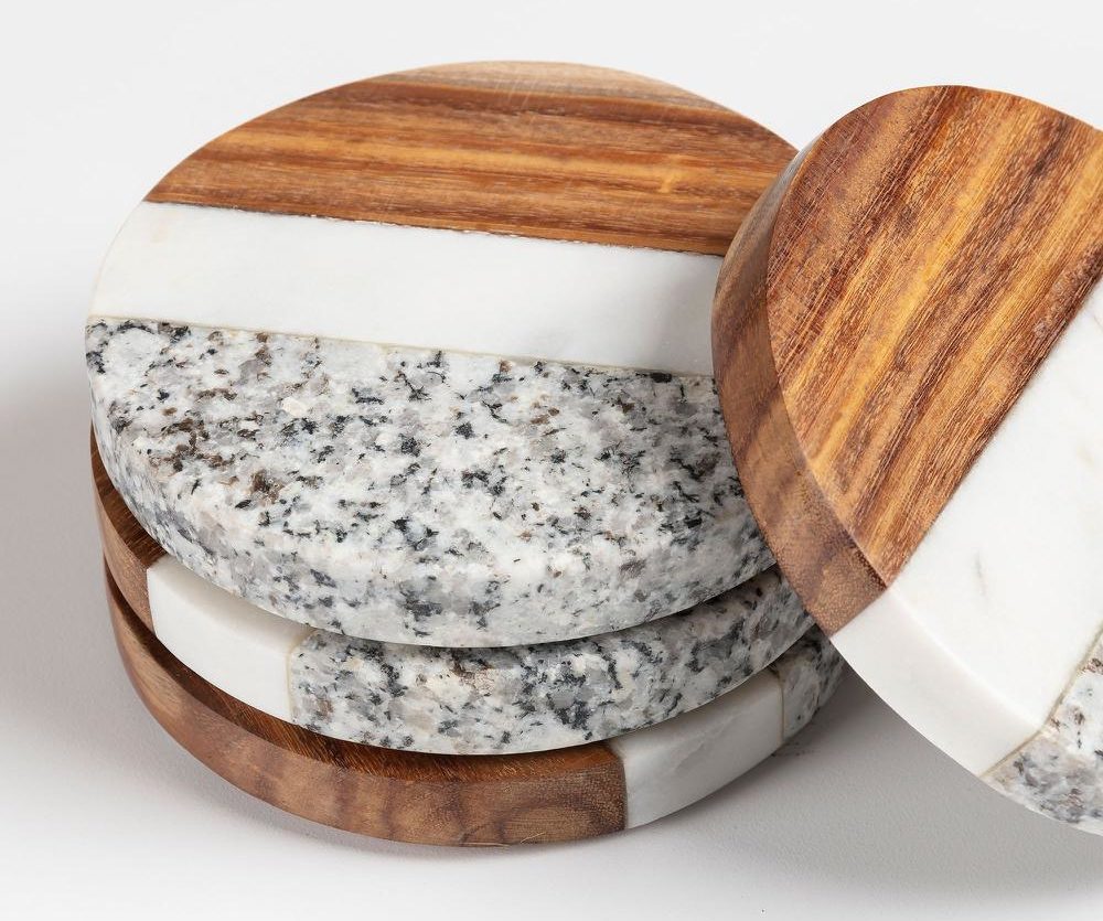 Aksesori seramik untuk panas dan sejuk dibuat dalam warna marmar. Set termasuk 4 produk bentuk yang berbeza: satu persegi, satu bulat dan dua coaster heksagon.
