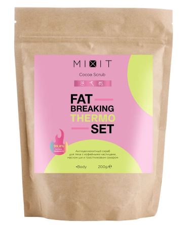 Mengupas dari makmal kosmetik MIXIT, yang termasuk bahan-bahan seperti zarah kopi, mentega shea dan gula tebu, dicirikan oleh kesan pemanasan. Mentega shea meningkatkan keanjalan dermis dan memenuhinya dengan nutrien. Ekstrak oren, badam manis dan lada hitam memulihkan keseimbangan hidro-lipid.