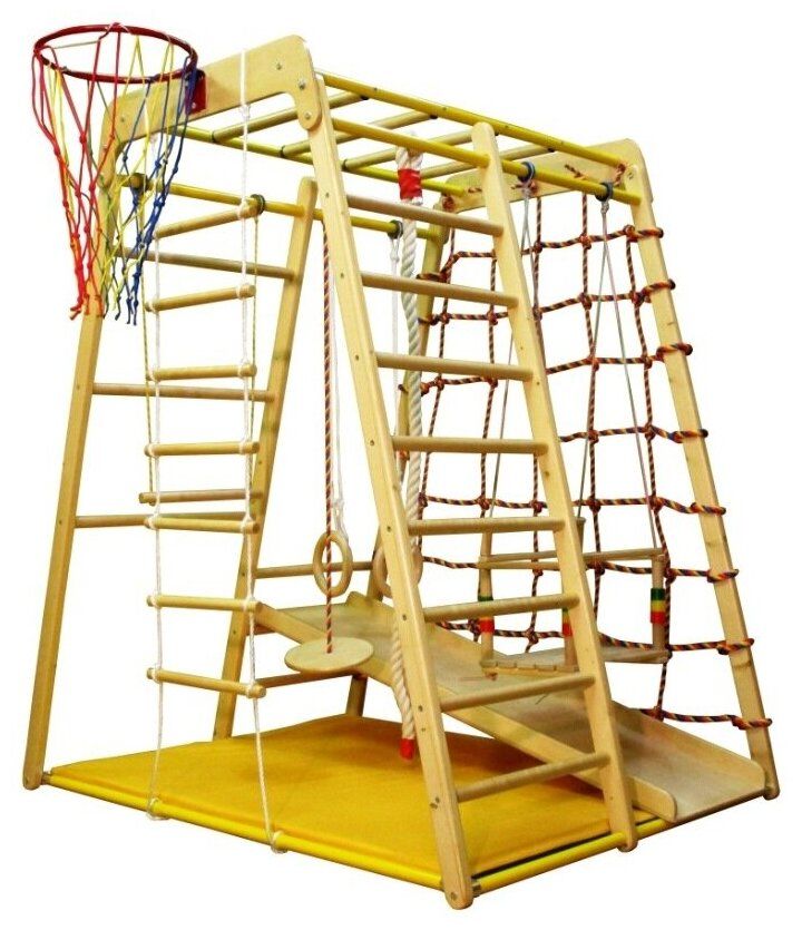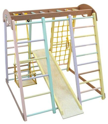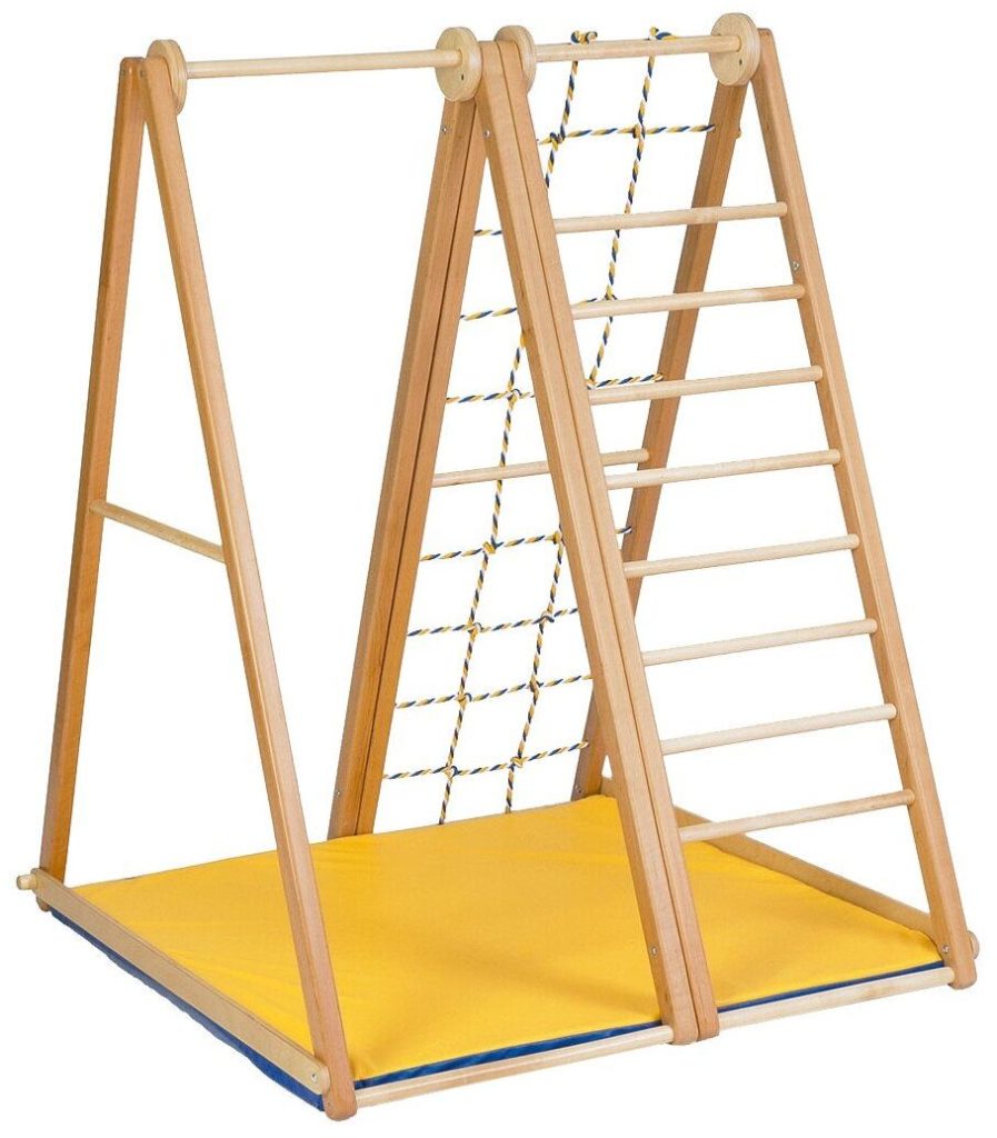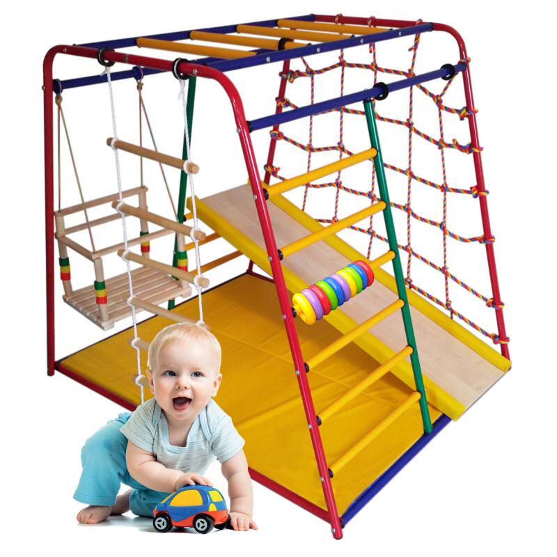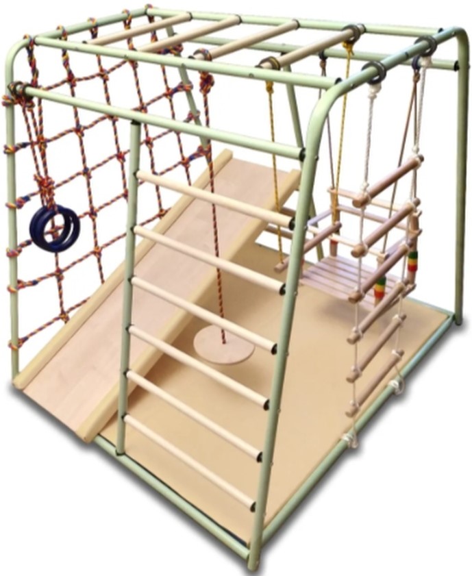 Kompleks sukan dan permainan kayu untuk kanak-kanak dari 2 tahun. Sesuai dengan sempurna ke dalam mana-mana bahagian dalam, sesuai untuk ruang kecil. Ia dilipat padat, tidak ada pengikat, ia dipasang terus di atas lantai. Dimensi: 1.35x1.0x1.0 m. Beban maksimum: 90 kg. Terdapat kemungkinan pemasangan di jalan. Kos: 17990 rubel.