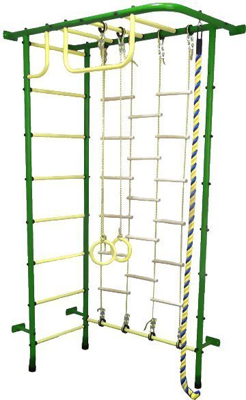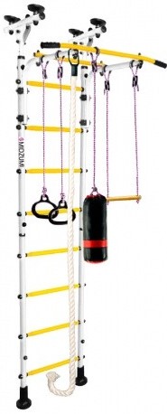 Pilihan hebat untuk ruang kecil. Pemasangan dalam spacer.Termasuk semua peralatan sukan yang diperlukan, termasuk: gelung bola keranjang, tali, buaian, gelang gimnastik, trapeze, palang mendatar. Bahan bingkai: logam. Berat: 36 kg. Dimensi: 115x54 cm Harga purata: 9990 rubel.