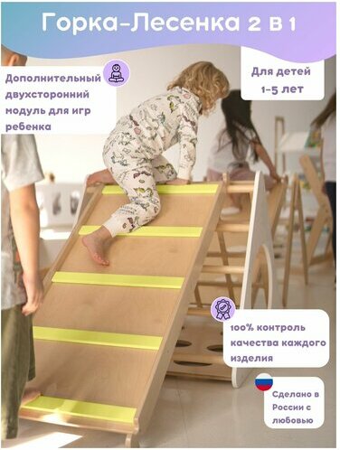 Kompleks padat tidak memerlukan pengancing pada dinding atau siling, ia dipasang di atas lantai tanpa pengikat tambahan. Ia mudah untuk bergerak di sekitar apartmen. Tangga dipasang dengan selamat pada bingkai, semua sambungan dilindungi oleh palam, menghapuskan kemungkinan melecet dan calar. Bahan cerun bukit: papan serpai. Berat: 34.6 kg. Dimensi: 123x133x120 cm Harga: 14660 rubel.