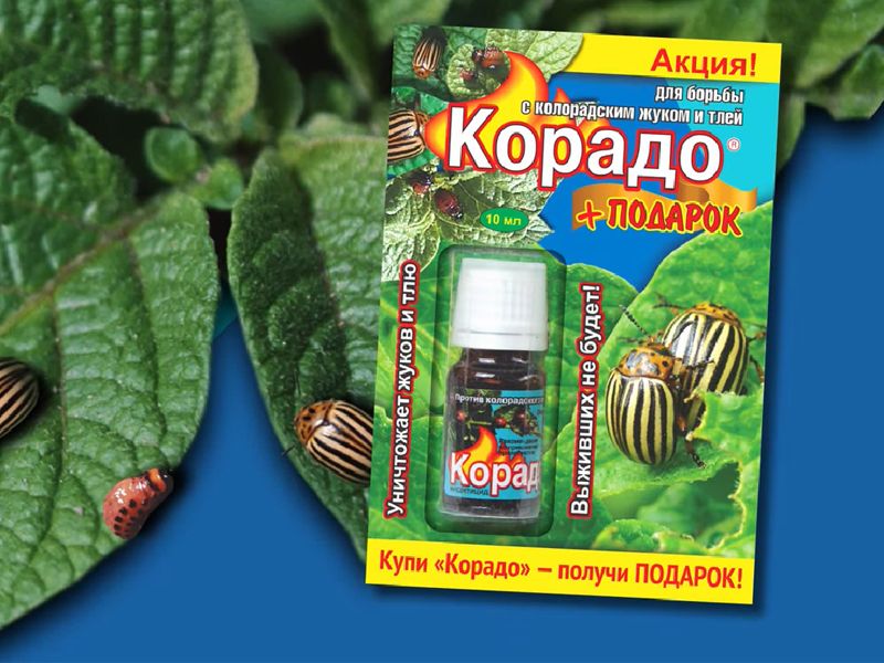 Bermaksud "Corado" direka untuk memerangi kumbang kentang Colorado dan kutu daun. Ia dijual dalam botol kecil, yang dibungkus dalam kotak kadbod.