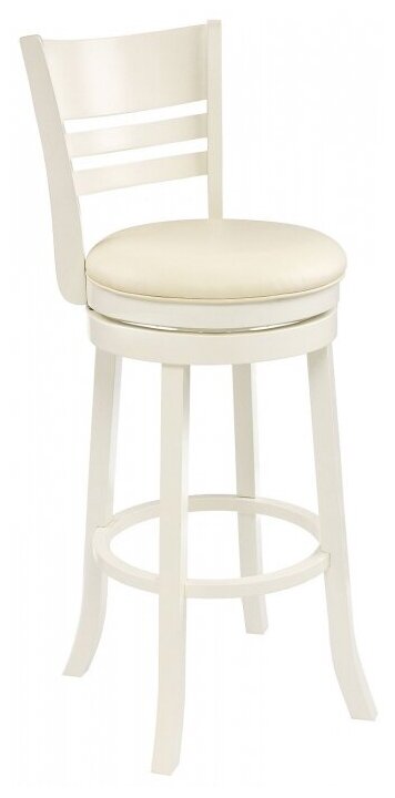 Tapak kayu pada kaki tinggi dicat dengan warna gading. Upholsteri lembut naik seperti krim mentega, mempunyai warna yang sama. Reka bentuk adalah asli. Bahagian belakang dengan tempat duduk mempunyai tapak bulat, diameter adalah sama dengan gelung atas sokongan. Nampaknya bahagian atas mudah disusun semula ke kaki yang berbeza ketinggian.